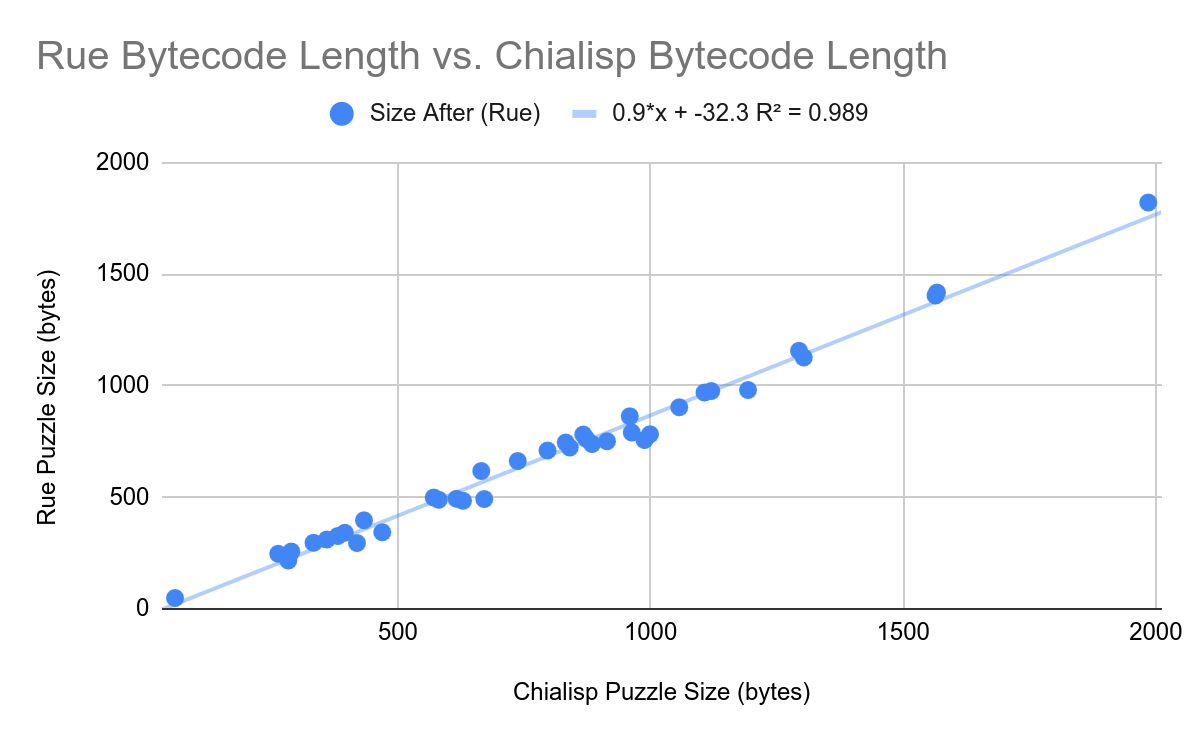 The slope of the regression line suggests that the Rue compiler also has a proportional advantage: each byte produced by Chialisp ‘corresponds’ to 0.9 bytes produced by Rue. This number likely comes from a few of the compiler optimizations Rue has that Chialisp hasn’t implemented, such as: